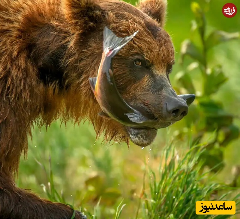 8. خرس گریزلی با شکار: عکاسی حیاتوحش: اندی پارکینسون، خرس گریزلی قدرتمندی ماهی سالمون تازهگرفتهاش را در چنگ دارد، قطرات آب هنوز از خز او میچکد. جزئیات تیز و محیط طبیعی، غریزه، قدرت و واقعیت خام زندگی در طبیعت را ثبت میکند.