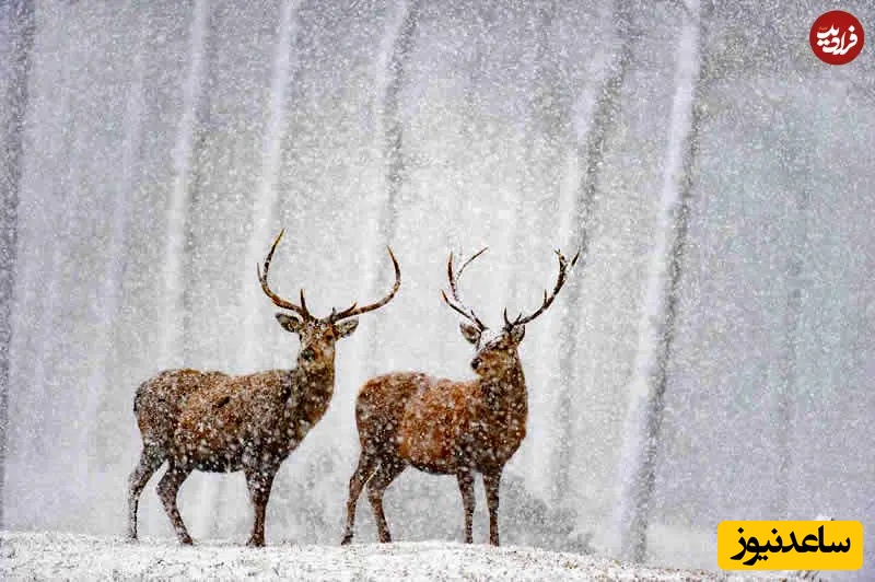 5. گوزنهای سرخ در برف: عکاسی حیاتوحش: اندی پارکینسون، دو گوزن سرخ شانهبهشانه ایستادهاند، در حالیکه برف سنگین پیرامونشان میبارد و شاخهایشان در برابر جنگلِ کمرنگِ پسزمینه برجسته شده است. این قاب آرام، قدرت جوّی، سکون و بقاء را در آغوش خاموش زمستان نشان میدهد.