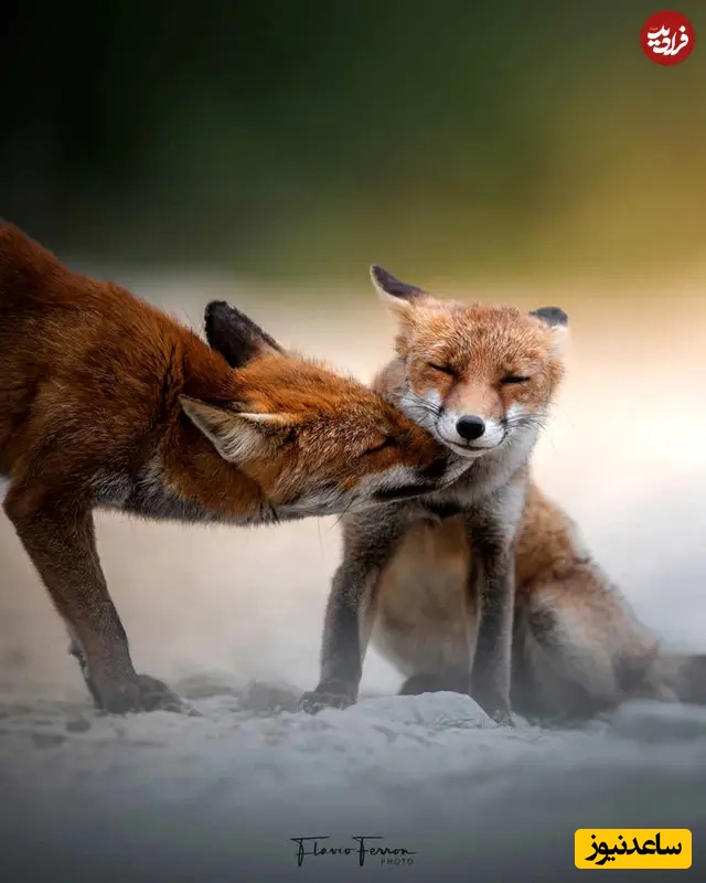 13. لحظهای لطیف: عکاسی حیاتوحش: فلاویو فرون، روباهی بهآرامی دیگری را نوازش میکند، چشمهایشان از اعتمادی آرام بسته است. فوکوس نرم و تونهای گرم، این تعامل گذرا را به صحنهای تأثیرگذار بدل کرده که محبت، پیوند و سویه ملایم حیات وحش را ثبت میکند.