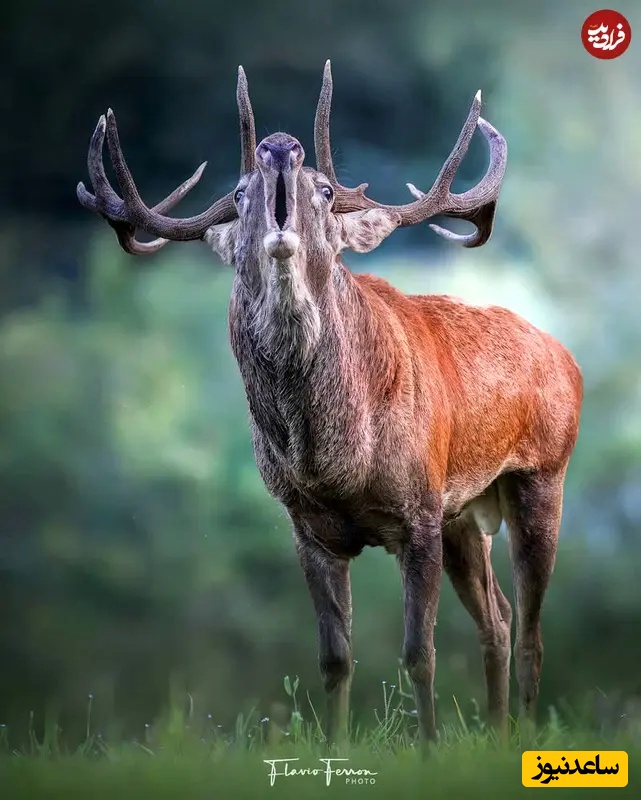 14. گوزن نر در فصل جفتگیری: عکاسی حیاتوحش: فلاویو فرون، گوزن نر قدرتمندی با شاخهای گسترده ایستاده و به درون جنگل بانگ میزند. جزئیات تیز و پسزمینه سبز نرم، سلطه و حضور او را برجسته کرده و قدرت خام، اعتمادبهنفس و روح فرمانروای طبیعت را نشان میدهد.