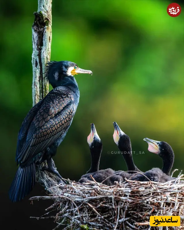 34. باکلان و جوجهها: عکاسی حیاتوحش هند: گورودات اس. اِی، باکلان والد کنار آشیانهای از جوجههای مشتاق ایستاده، منقارهایشان در انتظار بالا رفته است. پسزمینه سبز زنده و بافت پرها، صحنهای غنی ساخته که مراقبت، غریزه و تعهد آرام والدگری در حیاتوحش را ثبت میکند.