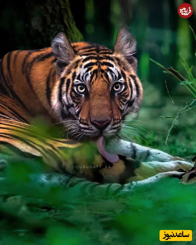 35. ببر در حال استراحت: عکاسی حیاتوحش هند: گورودات اس. اِی، ببر بنگال میان پوشش انبوه سبز پایین دراز کشیده، زبانش لحظهای کوتاه نمایان است. نگاه ثابتش از دل جنگل عبور میکند و آرامش هوشیارانه، قدرت پنهان و شدت خاموش شکارچی آسوده را ثبت میکند.