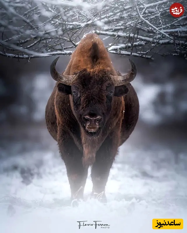 15. گاومیش اروپایی در برف: عکاسی حیاتوحش: فلاویو فرون، گاومیش عظیم اروپایی میان برف تازه به جلو گام برمیدارد، بخار نفسش در هوای سرد پیداست. این لحظه میان شاخههای یخزده قاب شده، لحظه چشمگیر تابآوری، وزن و سلطه آرام در چشماندازی منجمد.