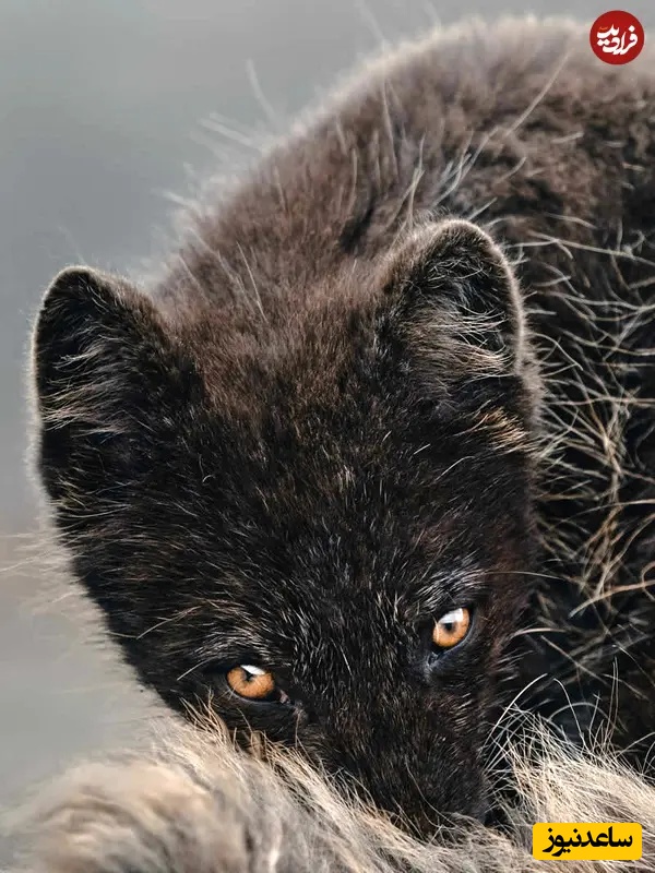 30. نمای نزدیک روباه قطبی: عکاسی حیاتوحش: دونال بوید، روباه قطبی سرش را پایین آورده، چشمان کهرباییاش در برابر خز تیره زمستانی میدرخشند. ترکیببندی فشرده و پسزمینه خاکستری نرم، قابی صمیمی و تأملبرانگیز ساخته که هوشیاری، استتار و بقای آرام در جهانی یخزده را ثبت میکند.