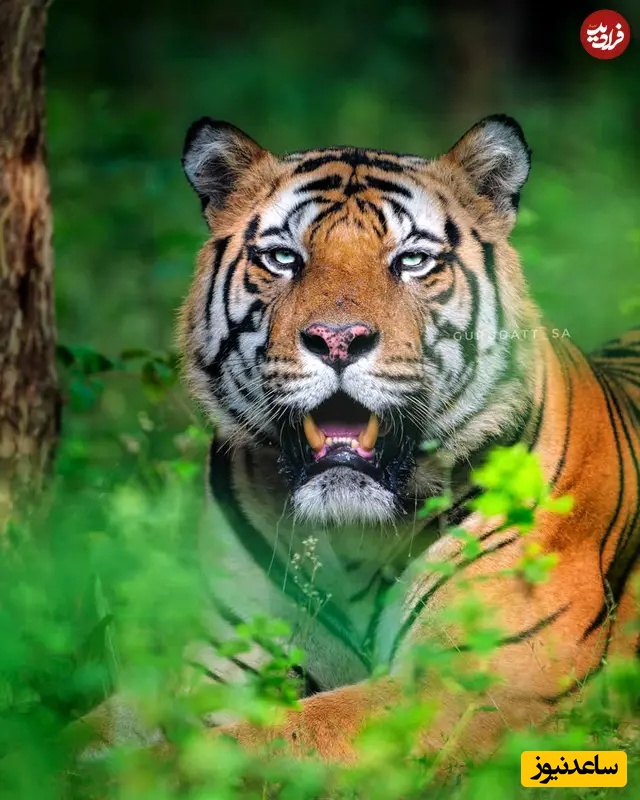 31. ببر در جنگل انبوه: عکاسی حیاتوحش هند: گورودات اس. اِی، ببر بنگال میان برگهای سبز زنده آرمیده، دهانش اندکی باز و نگاهش ثابت است. تضاد غنی میان شاخوبرگ روشن و نوارهای پررنگ، قابی قدرتمند ساخته که اقتدار خاموش، آگاهی و اعتمادبهنفس طبیعی یک شکارچی رأس هرم را ثبت میکند.