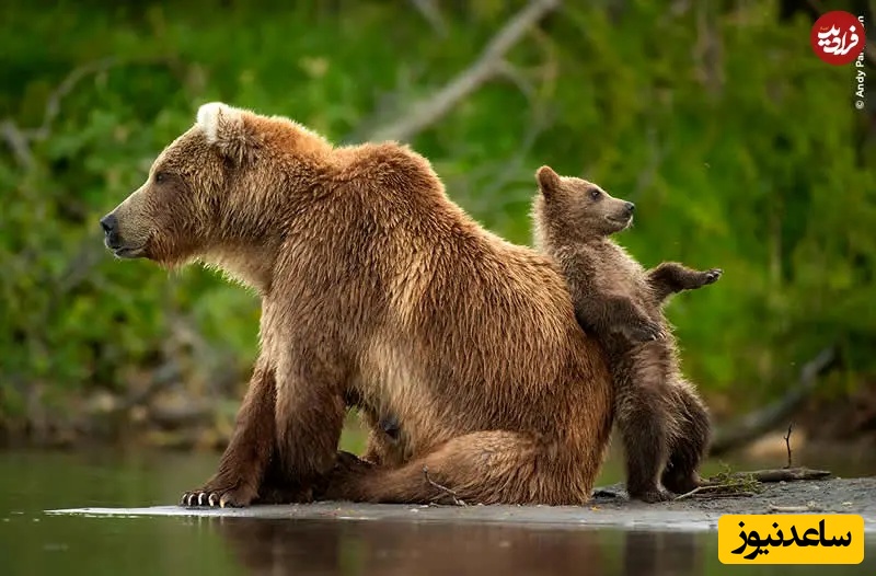 4. پیوندی آرام: عکاسی حیاتوحش: اندی پارکینسون، خرس مادر آرام کنار آب نشسته و تولهاش به پشت او تکیه داده، پنجه کوچکش از سر کنجکاوی بالا رفته است. پسزمینه سبز ملایم و حالت بدنی آرام، لحظهای اثرگذار آفریده که حفاظت، اعتماد و ارتباط خاموش در حیات وحش را روایت میکند.