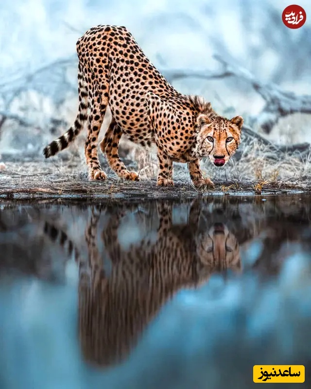 22. یوزپلنگ کنار آب: عکاسی حیاتوحش: دونال بوید، یوزپلنگ بدنش را کنار آب ساکن پایین میآورد، بدن خالدارش در بازتاب بهکمال دیده میشود. زبانش اندکی بیرون آمده و نگاهش هوشیار است. این صحنه چشمگیر سرعت، دقت و کمین را نشان میدهد.