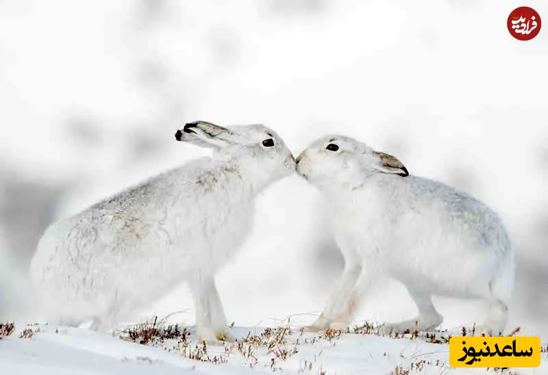 7. خرگوشهای قطبی در برف: عکاسی حیاتوحش: اندی پارکینسون، دو خرگوش قطبی بینیبهبینی در چشمانداز سفید و نرم زمستانی با هم روبهرو شدهاند، خز سفیدشان در برف حل شده است. این قاب آرام و صمیمی، پیوند، بقاء و لطافت را در قلب زمستان برجسته میکند.