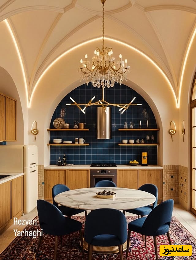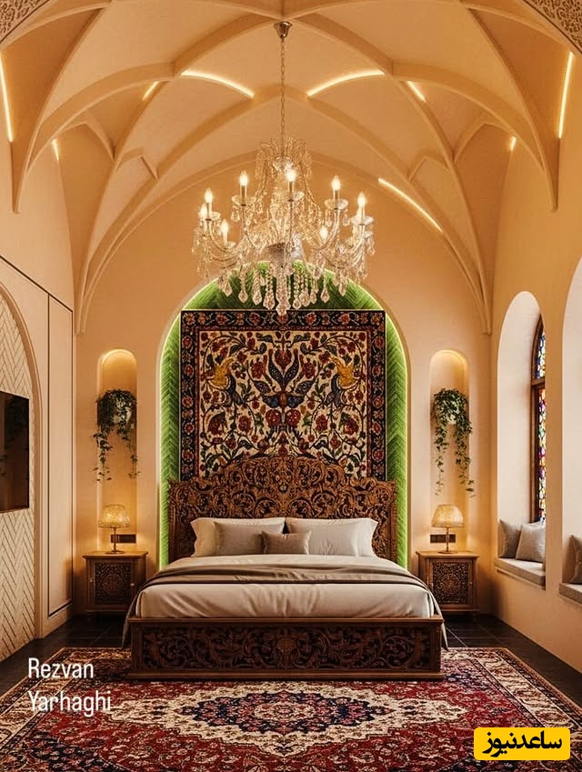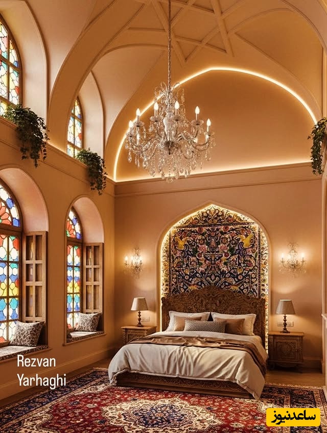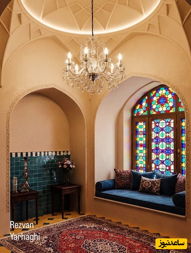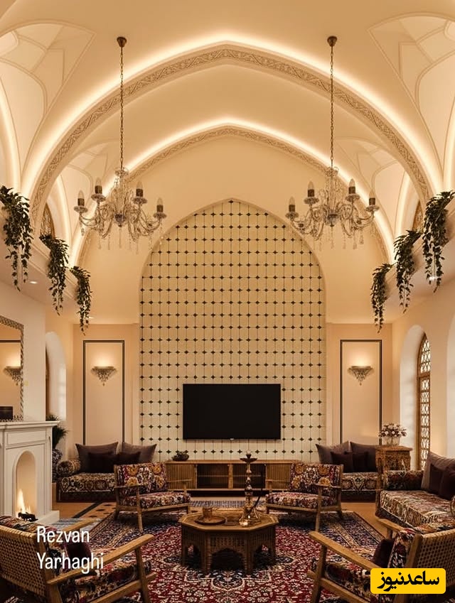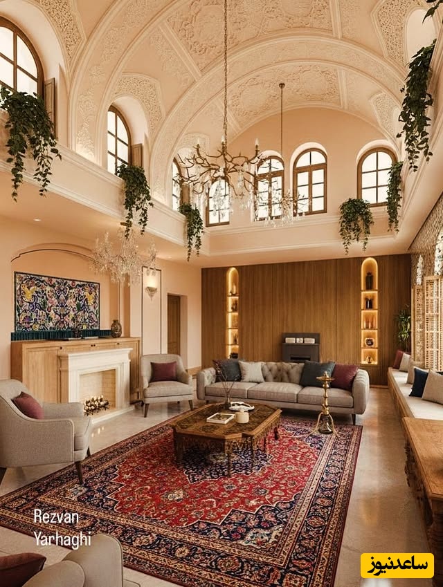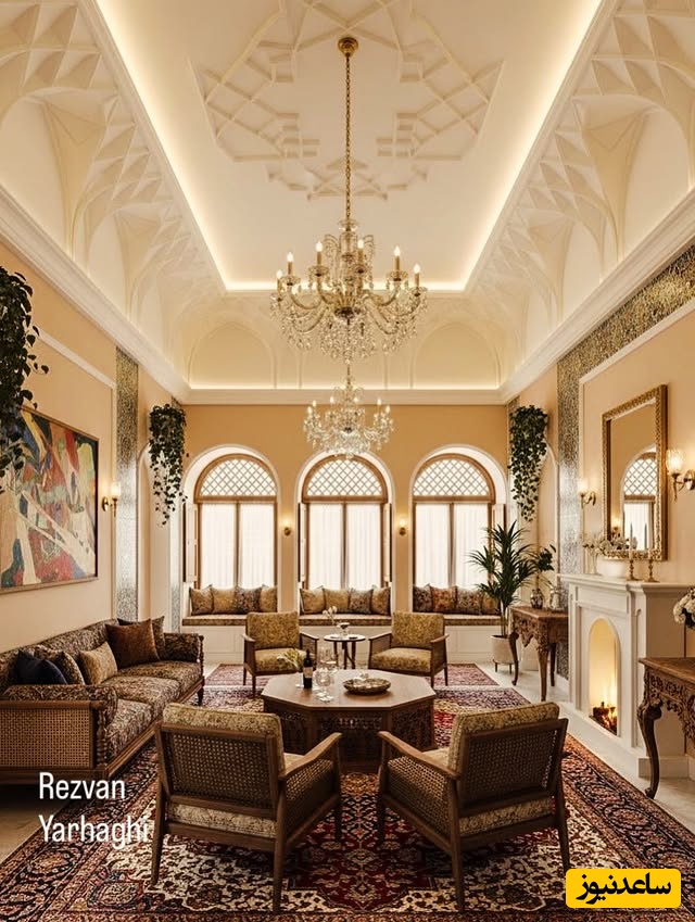 به گزارش سرویس دکوراسیون ساعدنیوز، این فضا ترکیبی از معماری سنتی ایرانی با گرایشهای نئوکلاسیک معاصر است. طاقها و قوسها، تناسبات متقارن و فرم کلی فضا ریشه در معماری ایرانی–اسلامی دارند. پنجرههای مشبک با شیشههای رنگی یادآور ارسی و نورپردازی خانههای تاریخی ایران هستند. سقف با الگوی هندسی و کاربندیمانند الهامگرفته از مقرنس و تزئینات سنتی است. در کنار آن، شومینه کلاسیک، لوستر کریستالی، مبلمان ساده و مینیمالتر نشانههای نئوکلاسیک و طراحی داخلی لوکس معاصر را نشان میدهد.