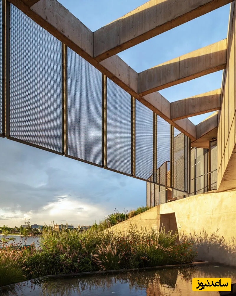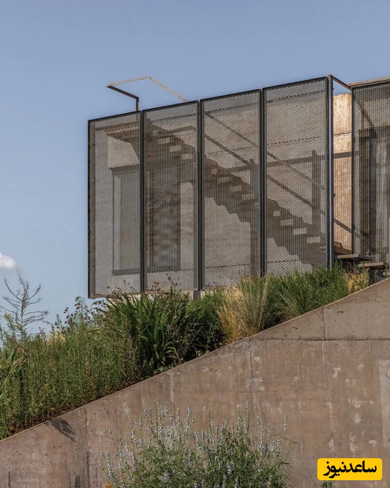 در نمای پشتی، استودیو گریتزو از یک پوسته فلزی سوراخ دار استفاده کرده که با فاصله از بدنه بتنی نصب شده است. این لایه نه تنها جرم سنگین بتن را تلطیف می کند، بلکه در طول روز با بازی نور و سایه، اتمسفر داخلی فضاها را مدام تغییر می دهد.
