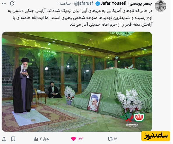 جعفر یوسفی: در حالیکه ناوهای آمریکایی به مرزهای آبی ایران نزدیک شدهاند، آرایش جنگی دشمن به اوج رسیده و شدیدترین تهدیدها متوجه شخص رهبری است، اما آیتالله خامنهای با آرامش دهه فجر را از حرم امام خمینی آغاز میکند.