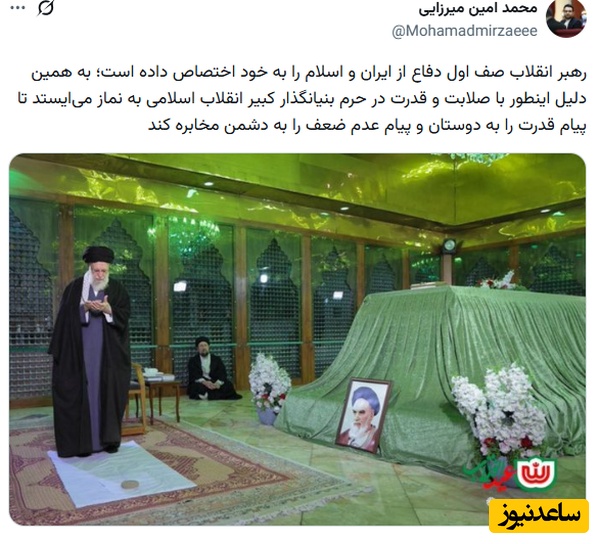 محمد میرزایی: رهبر انقلاب صف اول دفاع از ایران و اسلام را به خود اختصاص داده است؛ به همین دلیل اینطور با صلابت و قدرت در حرم بنیانگذار کبیر انقلاب اسلامی به نماز میایستد تا پیام قدرت را به دوستان و پیام عدم ضعف را به دشمن مخابره کند.