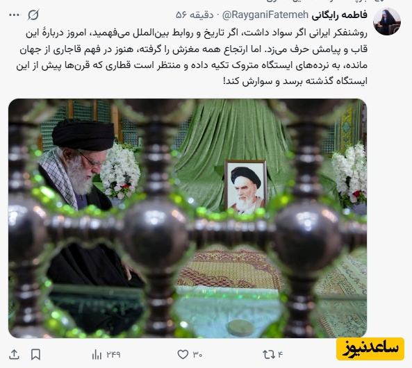 فاطمه رایگانی: روشنفکر ایرانی اگر سواد داشت، اگر تاریخ و روابط بینالملل میفهمید، امروز دربارهٔ این قاب و پیامش حرف میزد. اما ارتجاع همه مغزش را گرفته، هنوز در فهم قاجاری از جهان مانده، به نردههای ایستگاه متروک تکیه داده و منتظر است قطاری که قرنها پیش از این ایستگاه گذشته برسد و سوارش کند!