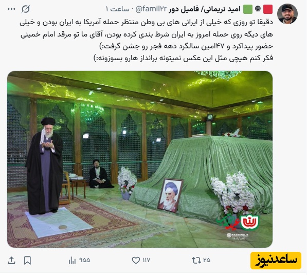 امید نریمانی: دقیقا تو روزی که خیلی از ایرانی های بی وطن منتظر حمله آمریکا به ایران بودن و خیلی های دیگه روی حمله امروز به ایران شرط بندی کرده بودن، آقای ما تو مرقد امام خمینی حضور پیداکرد و 47امین سالگرد دهه فجر رو جشن گرفت:)
