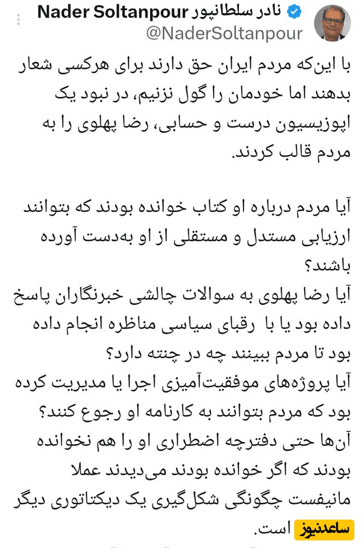 در همین راستا، «نادر سلطان پور» مجری سابق بیبیسی فارسی، طی پستی در شبکه ایکس نوشت: «با اینکه مردم ایران حق دارند برای هرکسی شعار بدهند اما خودمان را گول نزنیم، در نبود یک اپوزیسیون درست و حسابی، رضا پهلوی را به مردم قالب کردند.»
