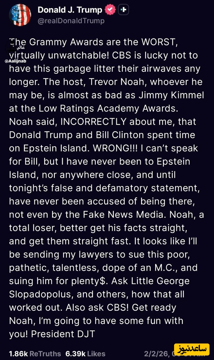 خداشاهده هیچوقت به جزیره اپستین نرفتم و همهی این حرفا علیه من، شایعهست. جوایز گرمی افتضاحن و نمی شه نگاهشون کرد. CBS خوششانسِ که دیگه این آشغالها رو پخش نمیکنه؛ مجری این برنامه افتضاحه، درست مثل جیمی کیمل تو مراسم اسکار. نوآ به اشتباه درموردم گفته که دونالد ترامپ و بیل کلینتون تو جزیره اپستین بودن و وقت گذروندن؛ نمیتونم به جای بیل حرف بزنم، ولی من اصلا به اون جزیره نرفتم و حتی نزدیکش هم نشدم.