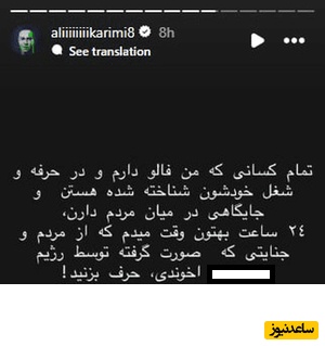 اخیراً علی کریمی با انتشار استوری در صفحه اینستاگرامش نوشت: «یعنی واقعاً دلیلی دارید برای فالوکردن این (نازنین بنیادی)؟! تا فردا میبینمتان؛ هرکس میخواهی باش. نازنین بنیادی نماد کسی است که یکشبه و از رقصیدن در کلیپ افشین و بعد حمایت فرقه ساینتولوژی و تام کروز شناخته شد و شد فعال سیاسی و بهاصطلاح اپوزیسیون جمهوری اسلامی و حالا در مقابل رسانههای جهان در مونیخ و رو به رضاشاه دوم؛ انقلاب ملی مردم را متهم به خشونت و انتقامجویی از قاتلان جوانان و مردم ایران میکند.»