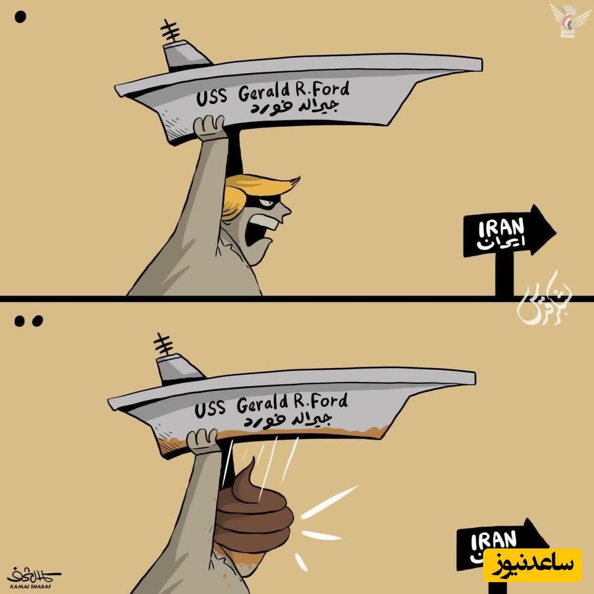 در همین راستا، کمال شرف، هنرمند یمنی، در کاریکاتوری جدید به این موضوع واکنش نشان داده است. در این اثر، دونالد ترامپ در حالی تصویر شده که ماکت این ناو را به نشانه تهدید به سمت ایران گرفته و فریاد میزند، اما در نمای دوم، همین ناو به دلیل نقص در سیستم توالت، بر سر او فرو میریزد.
