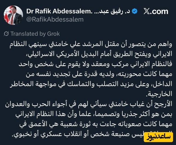 رفیق عبدالسلام، وزیر خارجه اسبق تونس، در توییتی با رد این تصور که حذف رهبر ایران میتواند به پایان نظام سیاسی این کشور منجر شود، نوشت: ساختار حاکمیتی ایران «پیچیده و چندلایه» است و بر یک فرد استوار نیست و توانایی بازسازی خود از درون و همچنین انسجام و مقاومت بیشتر در برابر خطرات خارجی را دارد.