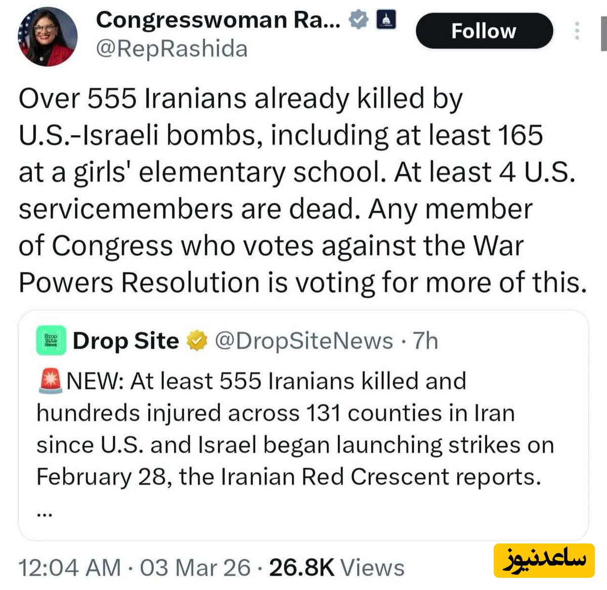 بیش از 555 ایرانی تاکنون توسط بمبهای آمریکایی-اسرائیلی کشته شدهاند، از جمله حداقل 165 نفر در یک مدرسه ابتدایی دخترانه. حداقل 4 سرباز آمریکایی کشته شدهاند. هر عضو کنگره که به قطعنامه اختیارات جنگی رأی منفی بدهد، به نفع قطعنامههای بیشتر از این نوع رأی داده است.