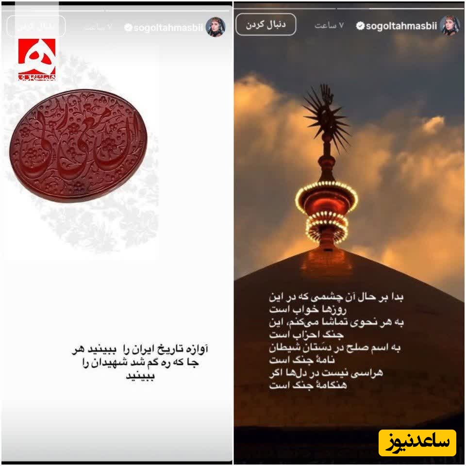 ساعدنیوز: سوگل طهماسبی بازیگر معروف در واکنش به شهادت رهبر انقلاب و جنگ تحمیلی اخیر در قالب استوری واکنش آتشین نشان داد.