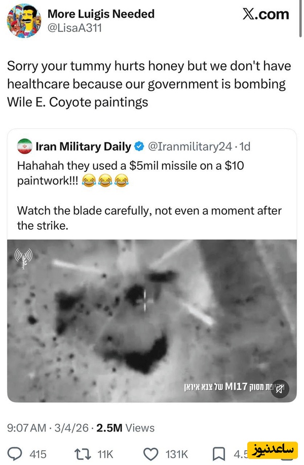 در جبهه اقتصادی، یک کاربر آمریکایی با کنایه به هزینه 5 میلیون دلاری موشک برای نابودی یک نقاشی 10 دلاری نوشت: «ما بیمه درمانی نداریم چون دولت ما داره روی نقاشی بمب میریزه.» این دروغها پیامدهای سنگینی داشت؛ سخنگوی سپاه پاسداران اعلام کرد در 4 روز اول جنگ، بیش از 680 نظامی آمریکایی کشته و زخمی شدهاند. همچنین علی لاریجانی، دبیر شورای عالی امنیت ملی، از اسارت تعدادی از نیروهای آمریکایی در منطقه خبر داده است.