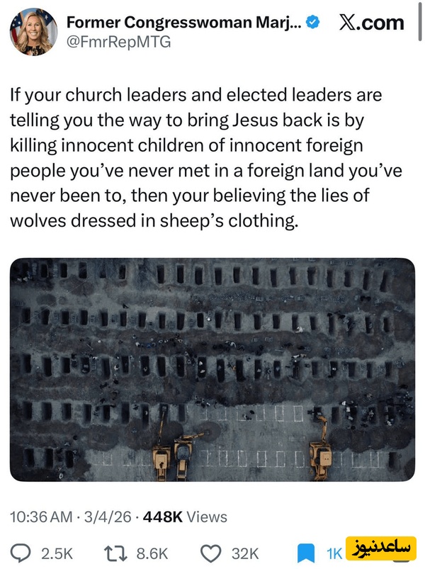 همچنین تیلور گرین، نماینده سابق کنگره، به مردم هشدار داد که دروغِ «گرگهایی در لباس میش» را درباره کشتن کودکان بیگناه برای اهداف مذهبی باور نکنند.
