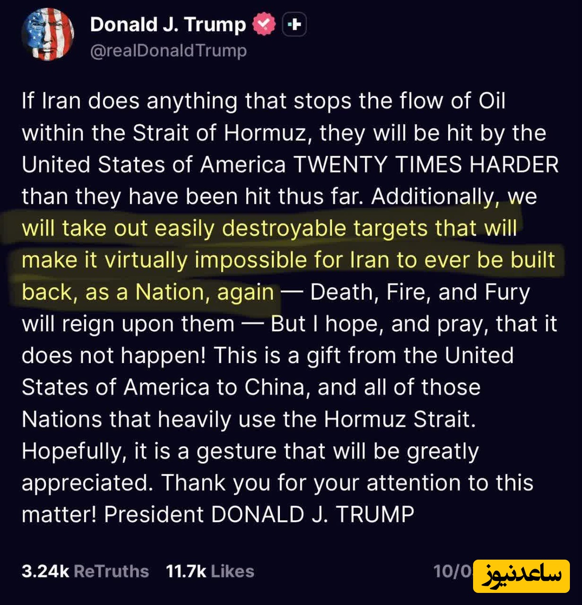 ترامپ حرامی امروز نوشته یک کاری میکنیم که «به عنوان ملت» دیگه ایرانی ها نتونن چیزی بسازن