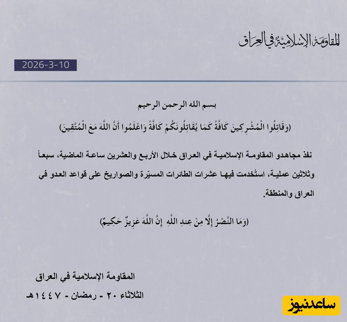 در همین راستا، خبرنگار شبکه خبری المسیره گزارش داد که مقر تیپ 30 الحشد الشعبی در استان نینوا واقع در شمال عراق نیز هدف حملات آمریکا و رژیم صهیونیستی قرار گرفته است