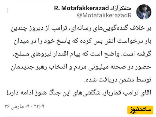[گمان میکردند با] ترور آیتالله علی خامنهای، مردم ایران قیام کرده و نظام را نابود میکنند اما برعکسِ آن رخ داده، آن هم به شکلی شگفتآور. مردم ایران در حال استقبال از جمهوری سوم به رهبری پسر آیتالله خامنهای هستند. بنا بر تمام گزارشها، او یک انقلابی واقعی است.