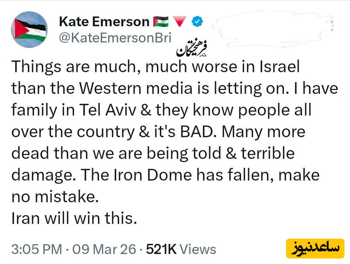 🔹تنگه هرمز بسته است، کردها از پیوستن به جنگ خودداری کردند، آذربایجان از پیوستن به جنگ خودداری کرد، حزبالله با قدرت بازگشته است، و موشکهای ایرانی بدون آژیر هشدار به تلآویو اصابت میکنند زیرا رادارها از کار افتادهاند..