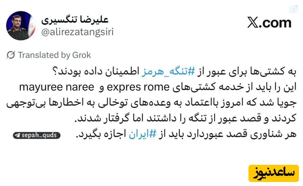 تنگسیری نوشت: «به کشتیها برای عبور از تنگه هرمز اطمینان داده بودند؟ این را باید از خدمهٔ کشتیهای expres rome و mayuree naree جویا شد که امروز با اعتماد به وعدههای توخالی به اخطارها بیتوجهی کردند و قصد عبور از تنگه را داشتند اما گرفتار شدند. هر شناوری قصد عبور دارد باید از ایران اجازه بگیرد».