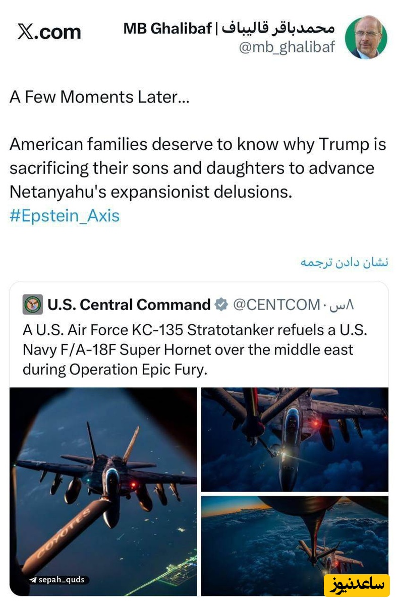 به گزارش سرویس سیاست پایگاه خبری ساعدنیوز، به نقل از خبرآنلاین، محمدباقر قالیباف رئیس مجلس به توییت سنتکام که پیش از اعلام خبر سقوط سوخترسان آمریکایی، از ماموریت آن در خاورمیانه خبر داده بود واکنش نشان داد و نوشت: