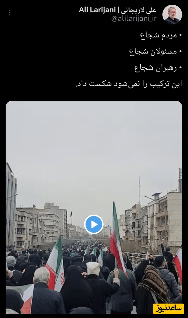 به گزارش سرویس سیاست پایگاه خبری ساعدنیوز، علی لاریجانی، دبیر شورای عالی امنیت ملی، با انتشار ویدئویی از راهپیمایی روز قدس امروز در تهران که همراه با حملات هوایی رژیم صهیونیستی و آمریکا صورت گرفت، نوشت:مردم شجاعمسئولان شجاعرهبران شجاعاین ترکیب را نمیشود شکست داد.با گذاشتن فیلمی از واکنش مردم به اصابت موشک به حاشیه راهپیمایی روز قدس در حساب کاربری خود در شبکه اجتماعی ایکس نوشت: • مردم شجاع• مسئولان شجاع• رهبران شجاعاین ترکیب را نمیشود شکست داد.