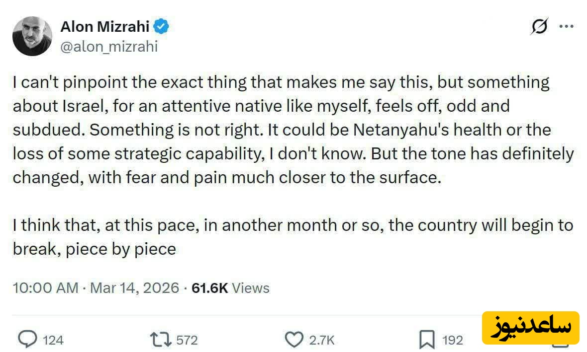 این تحلیلگر اسرائیلی در پست دیگری به فروپاشی رژیم اسرائیل در عرض یک ماه در صورت ادامه جنگ فعلی پرداخت و نوشت: «نمیتوانم دقیقاً بگویم چه چیزی باعث شده این حس را داشته باشم، اما برای یک فرد بومی هوشیار مانند من، چیزی در اسرائیل حس عجیب و غیرطبیعی دارد. چیزی درست نیست. ممکن است به وضعیت سلامتی نتانیاهو یا از دست رفتن برخی قابلیتهای راهبردی مربوط باشد، نمیدانم. اما لحن کشور قطعاً تغییر کرده و ترس و درد بسیار آشکار شده است».