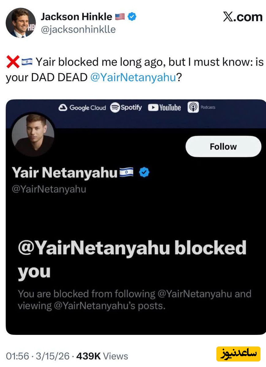 به گزارش سرویس سیاست پایگاه خبری ساعدنیوز، جکسون هینکل فعال مطرح فضای مجازی در آمریکا با قرار دادن عکسی از صفحه پسر نتانیاهو در ایکس نوشته است: