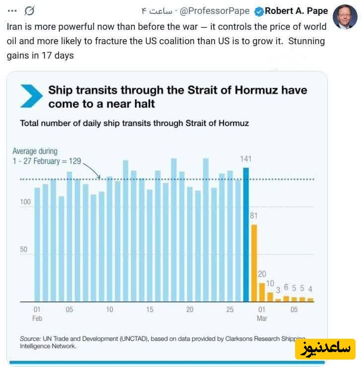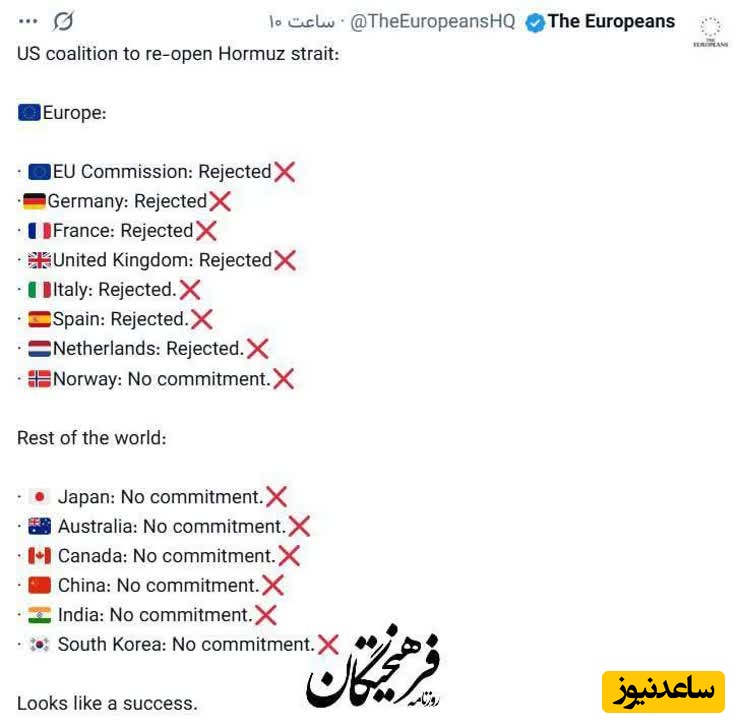 او گفت اگر ارتش آمریکا قادر به بازگشایی تنگه هرمز نیست نیروهای اروپایی هم به احتمال زیاد قادر به انجام این کار نخواهند بود.