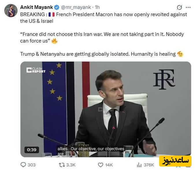 🔹او گفته: «فرانسه جنگیدن با ایران را انتخاب نکرده است. ما در آن شرکت نمیکنیم. هیچ کس نمیتواند ما را مجبور کند»