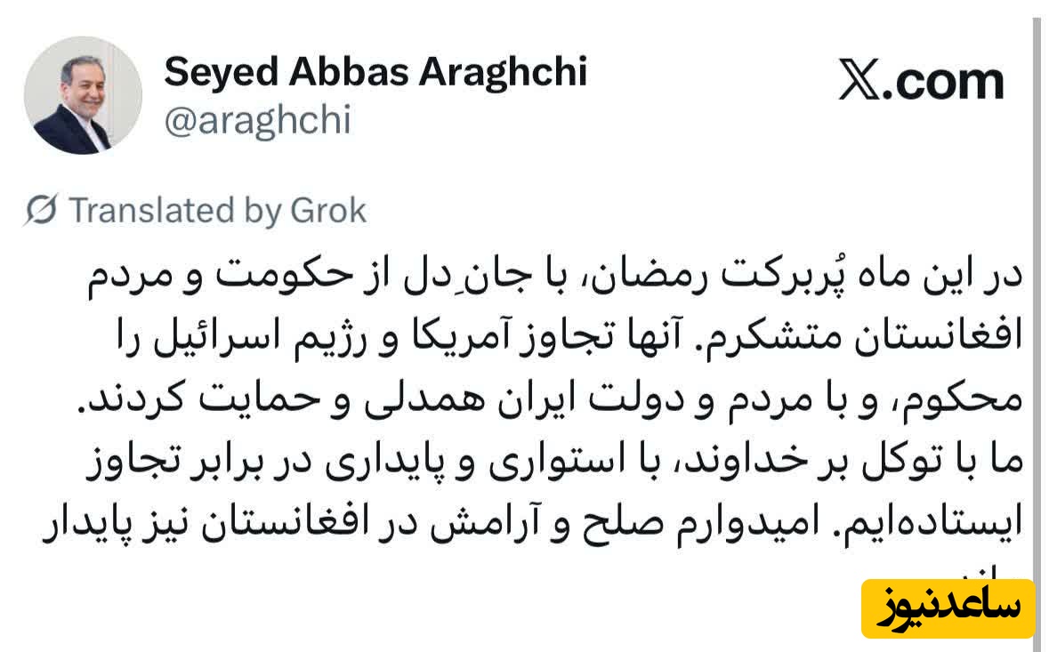 🔹در این ماه پُربرکت رمضان، با جانِ دل از حکومت و مردم افغانستان متشکرم. آنها تجاوز آمریکا و رژیم اسرائیل را محکوم، و با مردم و دولت ایران همدلی و حمایت کردند.