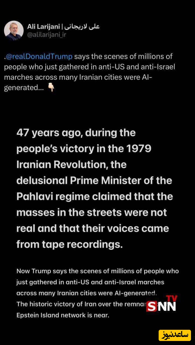 حالا ترامپ درباره تجمعات میلیونی ضدامریکایی و ضداسرائیلی در شهرهای ایران میگوید این تصاویر هوش مصنوعی است.