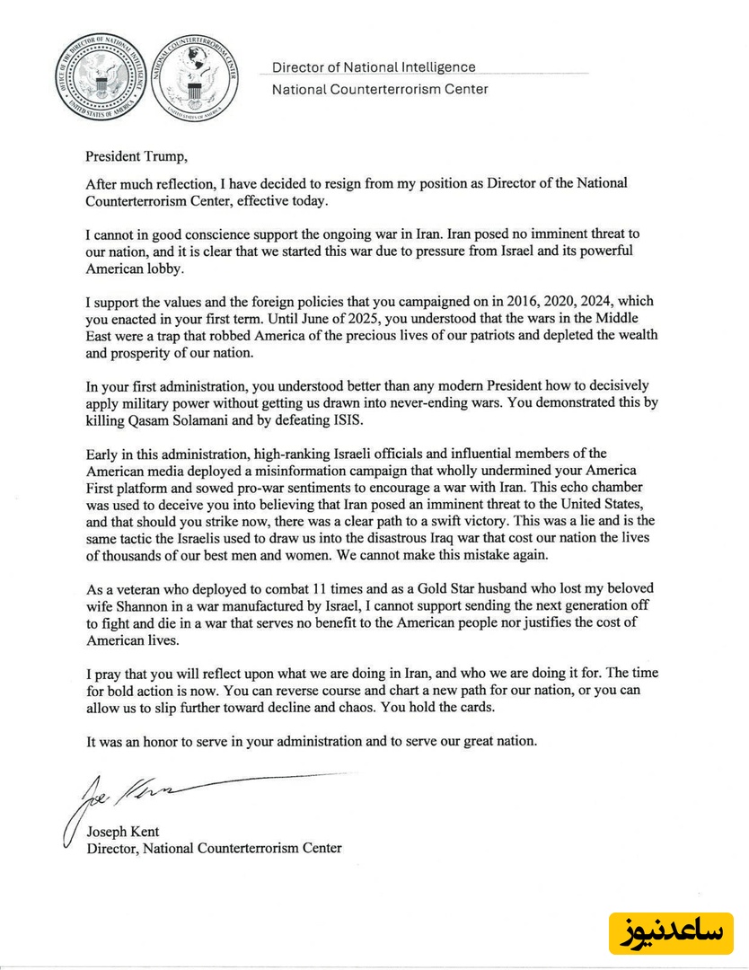 به گزارش سرویس سیاسی پایگاه خبری ساعدنیوز، رسانههای آمریکایی از استعفای مدیر مرکز ملی مبارزه با تروریسم آمریکا، جوزف کِنت، خبر میدهند.