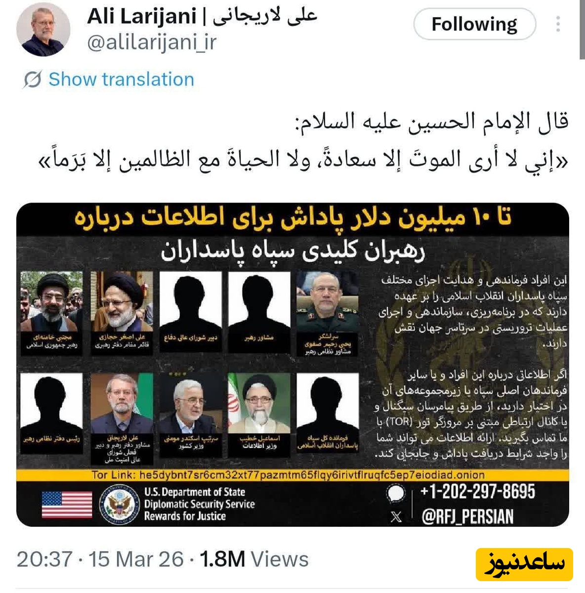 به گزارش سرویس سیاست پایگاه خبری ساعدنیوز، شهید علی لاریجانی در واکنش به جایزه 10 میلیون دلاری آمریکا برای یافت او، در شبکه اجتماعی ایکس حدیثی از امام حسین(ع) را منتشر کرده بود که در آن آمده است: