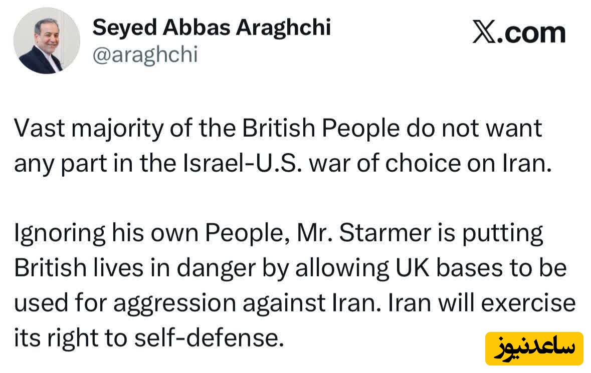 🔹آقای استارمر، با نادیده گرفتن خواست مردم خود، با در اختیار قرار دادن پایگاههای بریتانیا برای اقدامات تجاوزکارانه علیه ایران، جان شهروندان بریتانیایی را به خطر میاندازد.