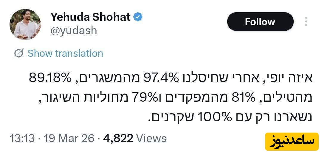 اعلام «نابودی صنعت موشکی ایران» دقیقاً در همان لحظهای که تو حرف میزنی و موشکها از ایران به سمت اسرائیل شلیک میشوند و شهروندان شمال به پناهگاهها میروند، این توهین به تلاش و استقامت شهروندان اسرائیل است.