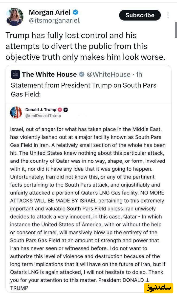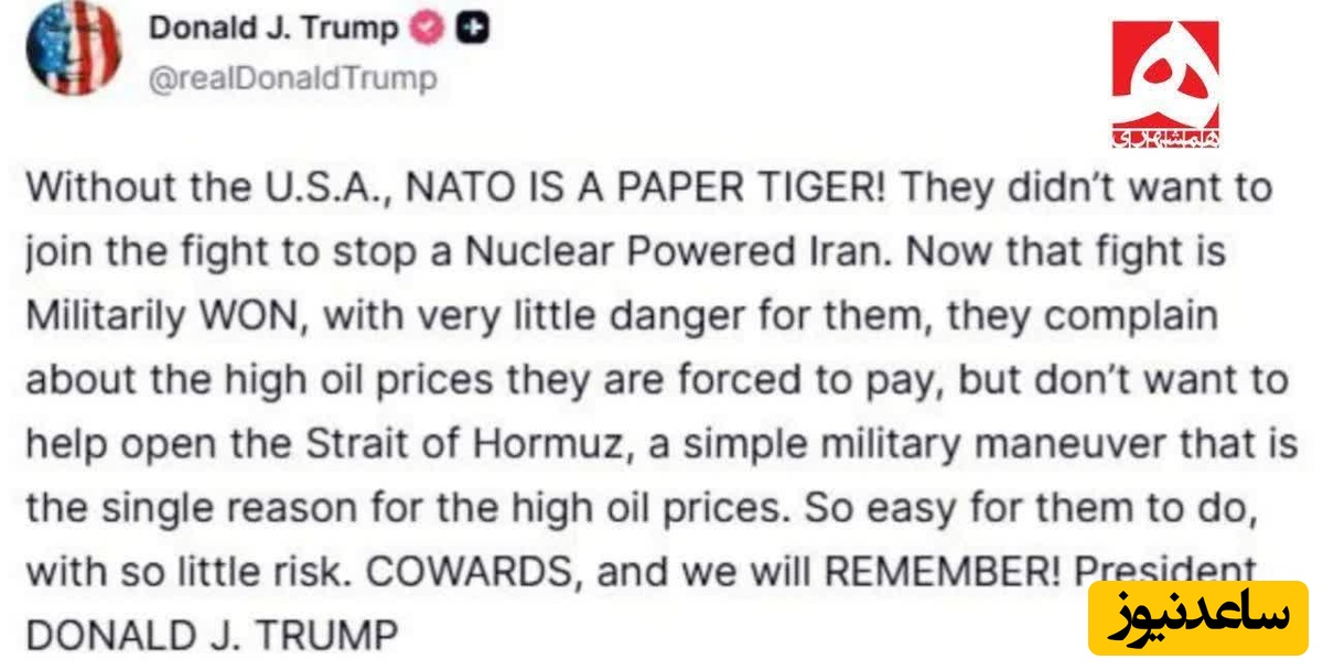 🔹ترامپ کله زرد که تا کنون موفقیتی در اقناع افکار عمومی در آغاز جنگ با ایران نداشته مدعی شده که تهران قصد داشت خاورمیانه را تصرف کند. اگر آنها سلاح هستهای داشتند از آن استفاده میکردند.