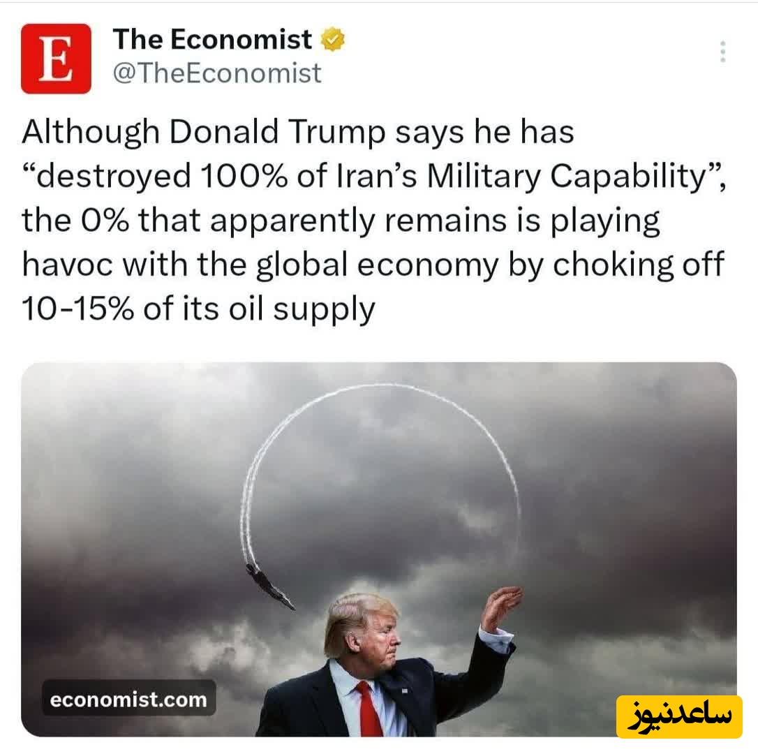 🔹اگرچه دونالد ترامپ میگوید که «100٪ از توانایی نظامی ایران را نابود کرده است»، اما ظاهراً صفر درصد باقیمانده با کاهش 10 تا 15٪ از عرضه نفت، اقتصاد جهانی را به شدت تحت تأثیر قرار میدهد.