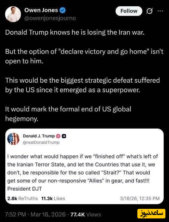 🔹ترامپ هنوز نه برای ما و نه مردم آمریکا و حتی متحدانمان در ناتو روشن نکرده که علت تجاوز به خاک ایران چه بوده با این حال درخواست تامین مالی میکند. استراتژی و نه نقطه پایان جنگ مشخص نیست.