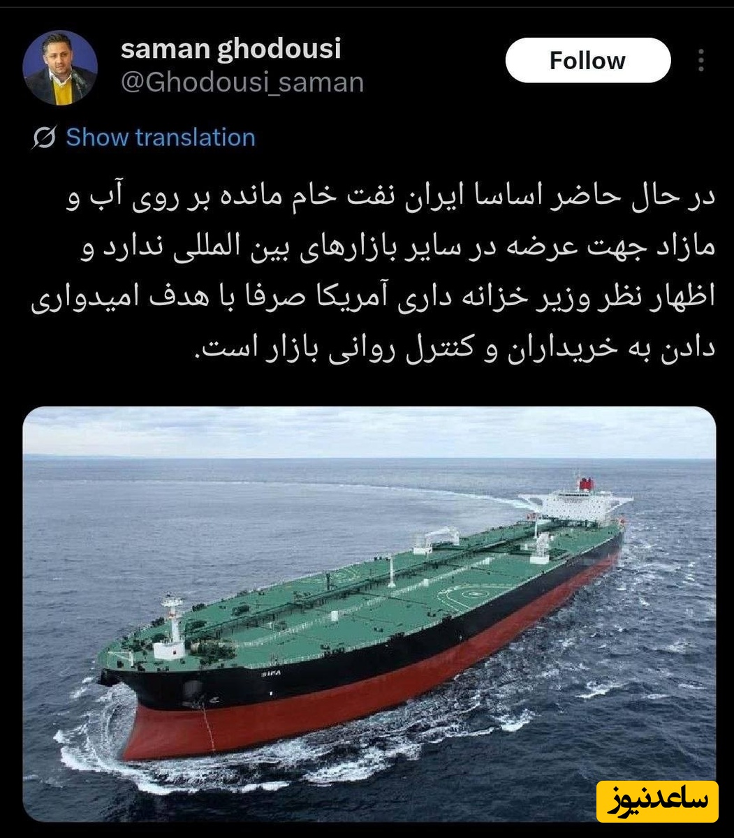 سامان قدوسی سخنگوی وزارت نفت نوشت: در حال حاضر اساسا ایران نفت خام مانده بر روی آب و مازاد جهت عرضه در سایر بازارهای بینالمللی ندارد. اظهارنظر وزیر خزانهداری آمریکا صرفا با هدف امیدواری دادن به خریداران و کنترل روانی بازار است.