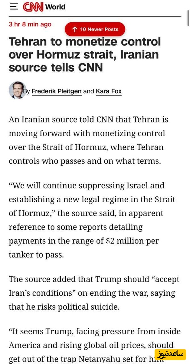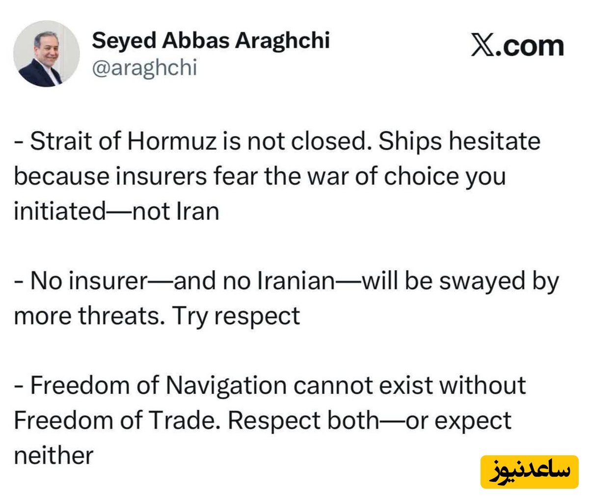 🔹تنگه هرمز بسته نشده است. توقف کشتیها بهخاطر ترس شرکتهای بیمه از «جنگ انتخابی» است که شما آغاز کردهاید، نه ایران.