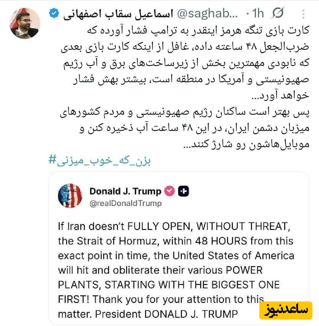 مردم عزیز در پاسخ به تهدید ترامپ برای زدن به زیرساختها به خیابانها بیایید و پرچم آمریکا را آتش بزنید.
